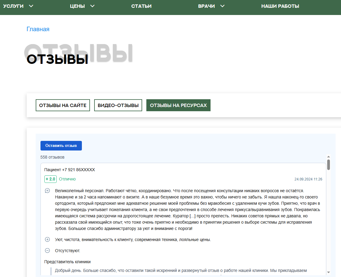 Положительные отзывы можно разместить на сайте клиники, однако нельзя игнорировать и негативные отклики. Важно оперативно и профессионально реагировать на критику, чтобы показать недовольным клиентам готовность решать проблемы и учитывать их мнение.