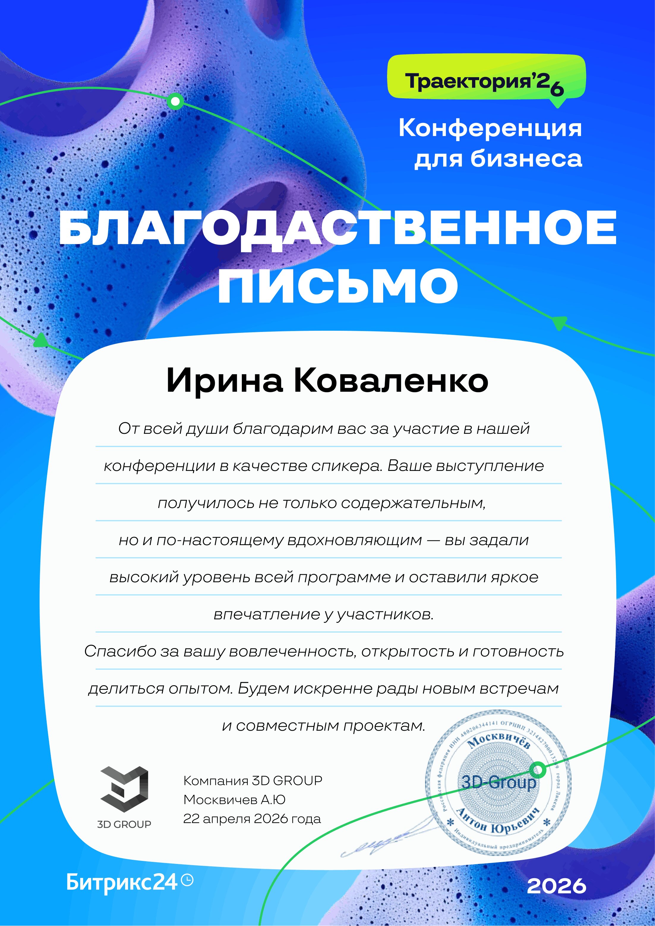 - Спикер на международной online-конференции для мемориальных компаний. Доклад: «Привлечение клиентов из интернета и анализ работы Отдела продаж»